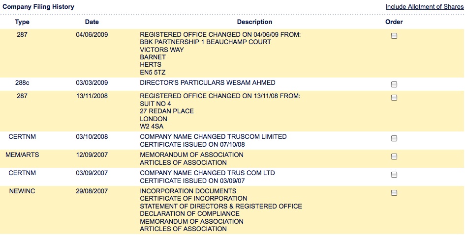 In fact, there appear to be several changes to the record since this company was founded – in August 2007. It first appeared as Trus Com Ltd, then changed to Truscom Ltd before metamorphosing into Forte1 Ltd in October 2008. The company has also changed address twice – from a W2 4SA address in London to an address in Barnet on the outskirts of London.