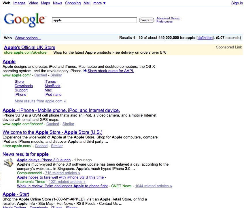 On the right of the screen are various suggestions for alternative searches. For example, a search for apple gives: