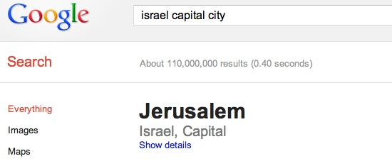 It’s not difficult to check such facts. There are numerous web-sites that list country capitals, currency and much more. For example, About.com has a geography section listing capitals. About.com is compiled by subject experts and is a good first stop when looking for general information – whether about geography, science, or many other school curriculum topics. Wikipedia also has a page listing country capitals. A quick search on WolframAlpha lists Jerusalem as Israel’s capital although an equivalent search fails on Palestine – perhaps because Palestine is not yet a country. There is also WorldCapitals.info – another listing, and the CIA Factbook, which correctly names Jerusalem as Israel’s capital. Whatever one may think about the CIA as an organisation, its website giving information on the countries of the world is generally reliable and an excellent site for anybody trying to find geographical information.